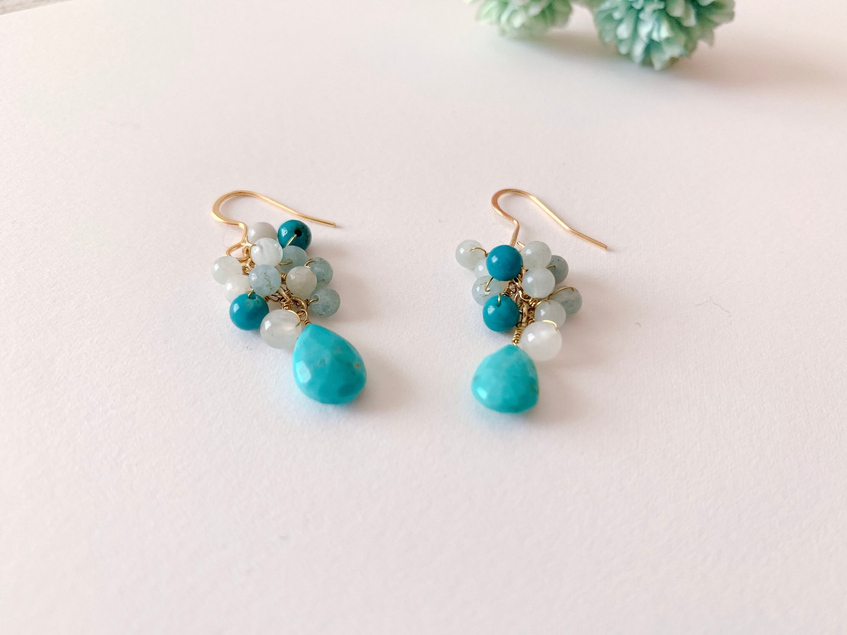 ターコイズ・アクアマリン・ムーンストーンのビーズを合わせました。これからの季節にピッタリの耳飾りに仕上がりました!