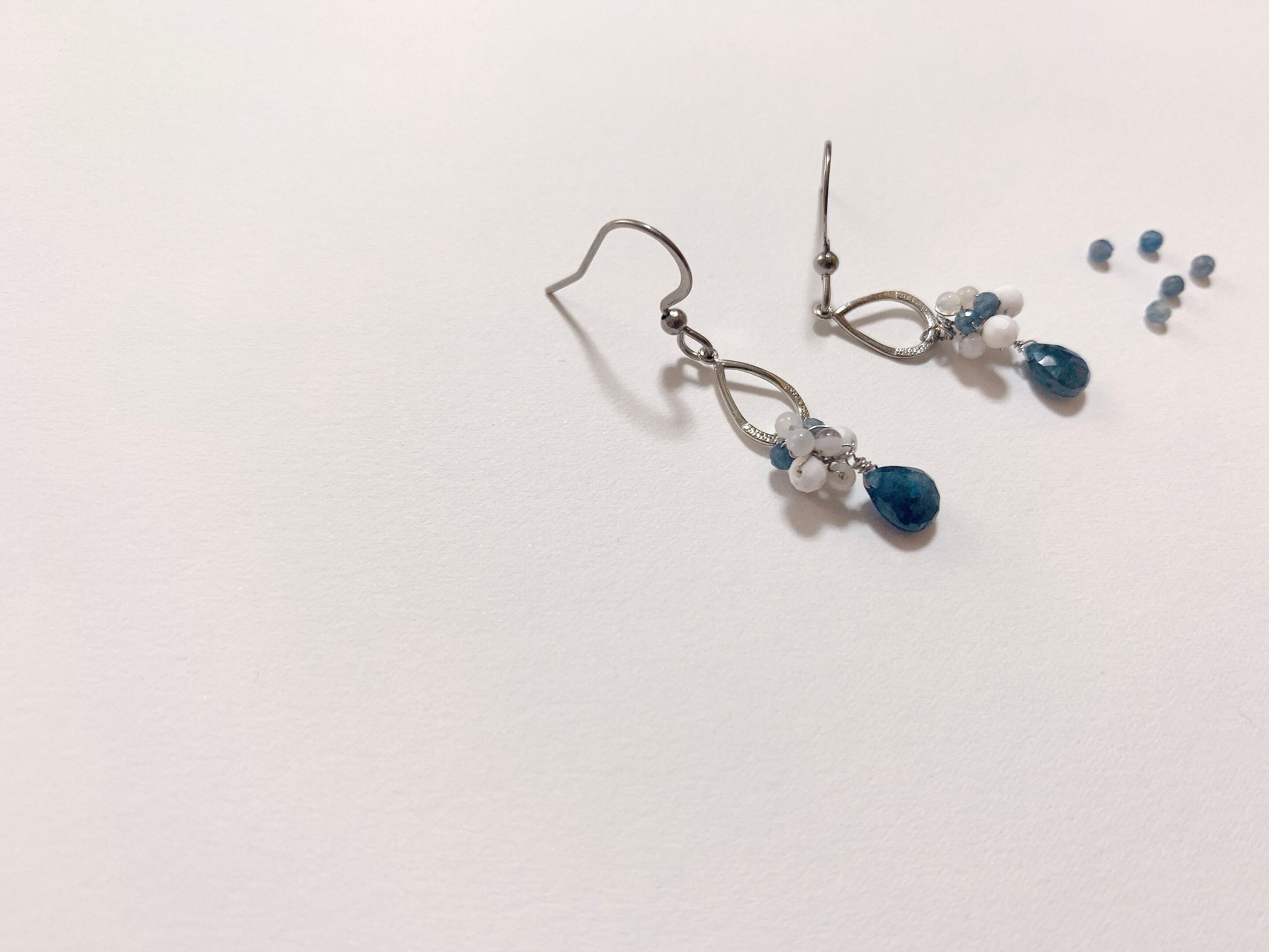 ブルーサファイアにホワイトオニキス・アゲート・ブルーサファイアのビーズとシルバーパーツを合わせています。