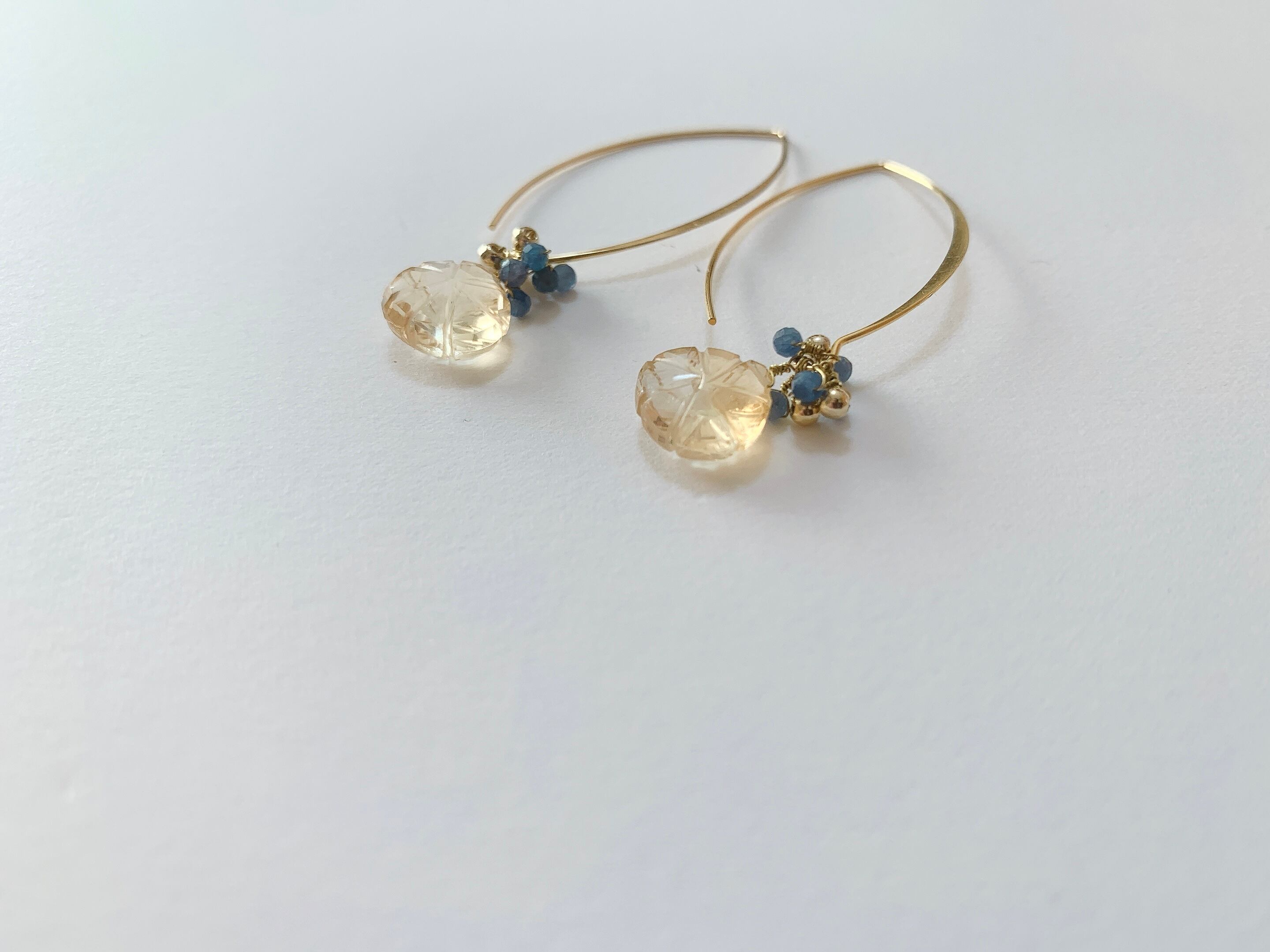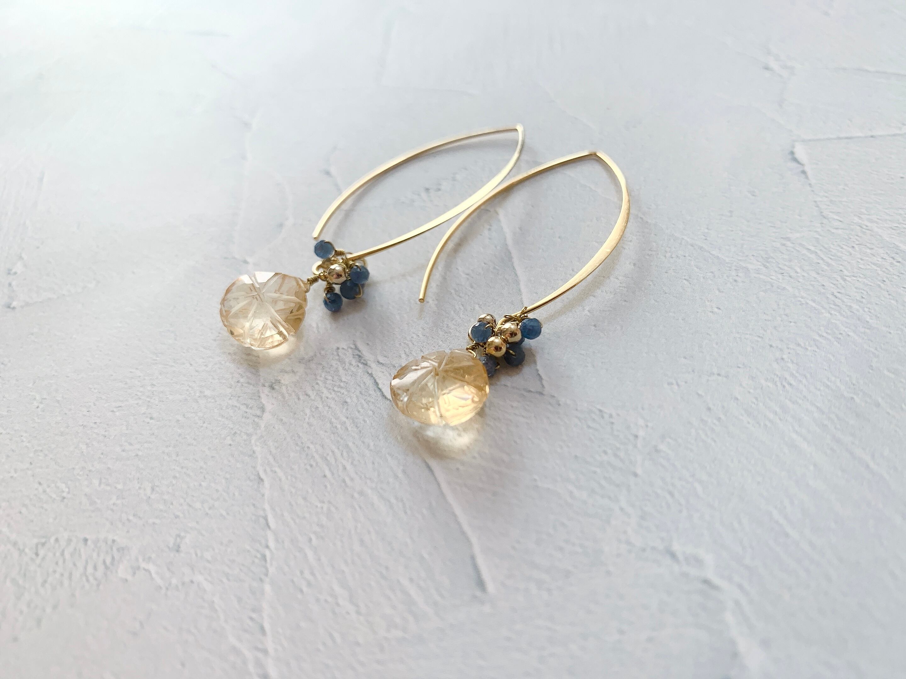シトリンにブルーサファイアとゴールド色のビーズを合わせています。彫りの入った可愛らしいシトリンを少し大人っぽく仕上げました!