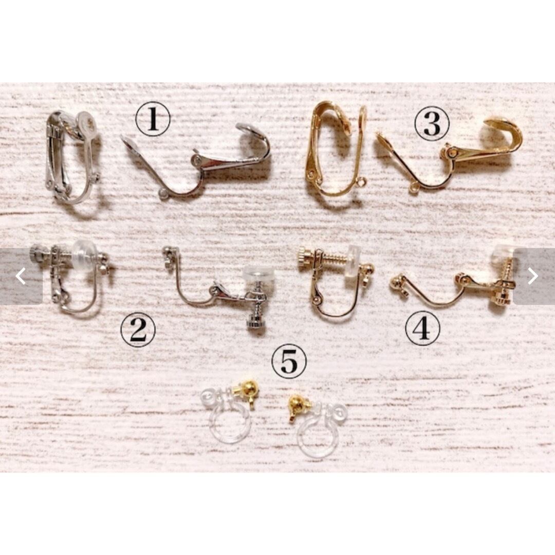 5種類のイヤリングを載せていますのでお選び頂きコメント欄にご希望のイヤリング番号をご記入下さい。ご記入の無い場合はピアスでのお渡しとなります。