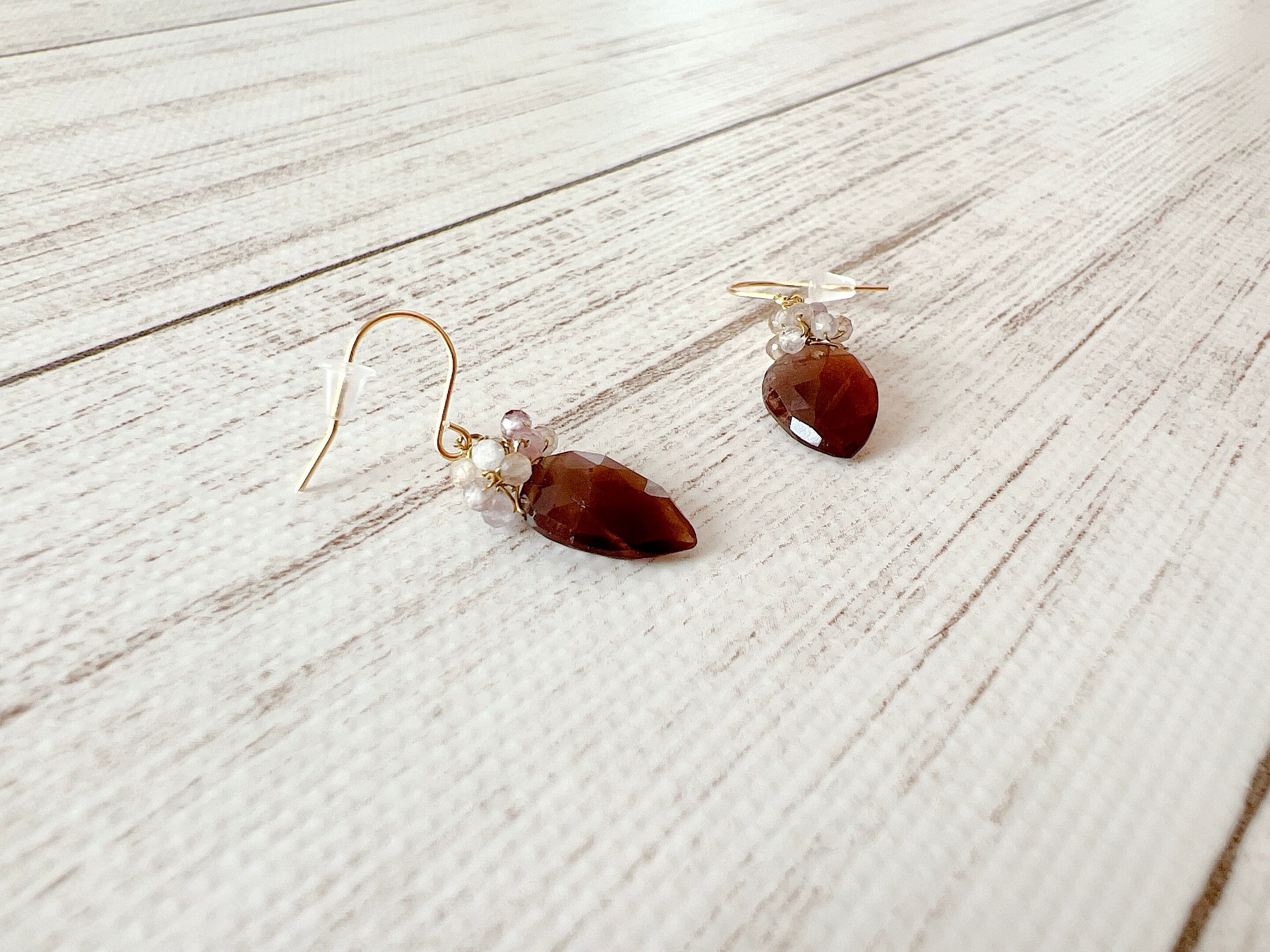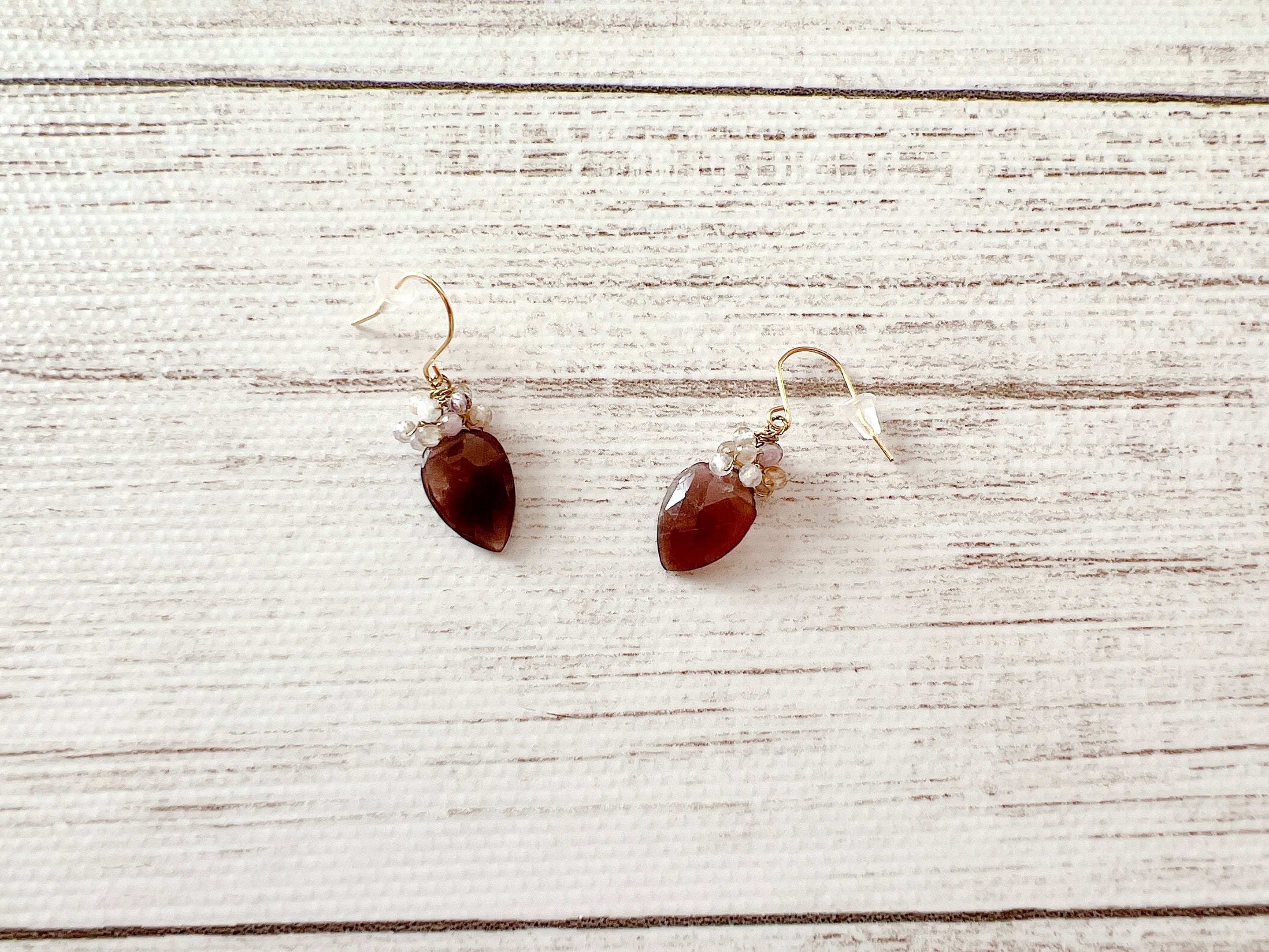イチゴのような程よい甘さの可愛いピアスが完成しました。写真ではラブラドライトが暗く見えますが、身につけると透け感があり綺麗です。
