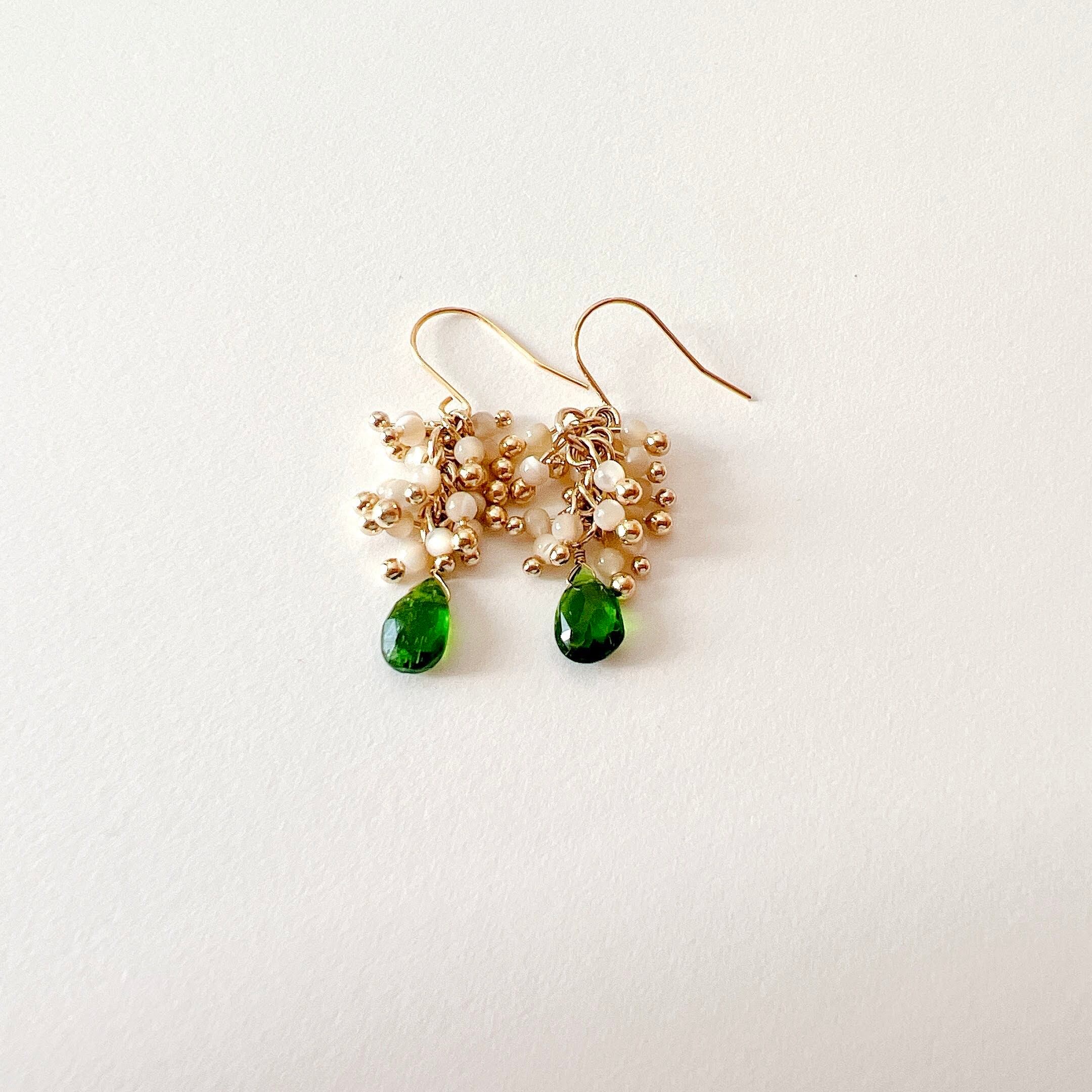 クロムダイオプサイドにオパールのビーズをあわせました。オパールのジャラジャラ感が華やかさをアップし、クロムダイオプサイドのグリーンが全体を引き締めています。