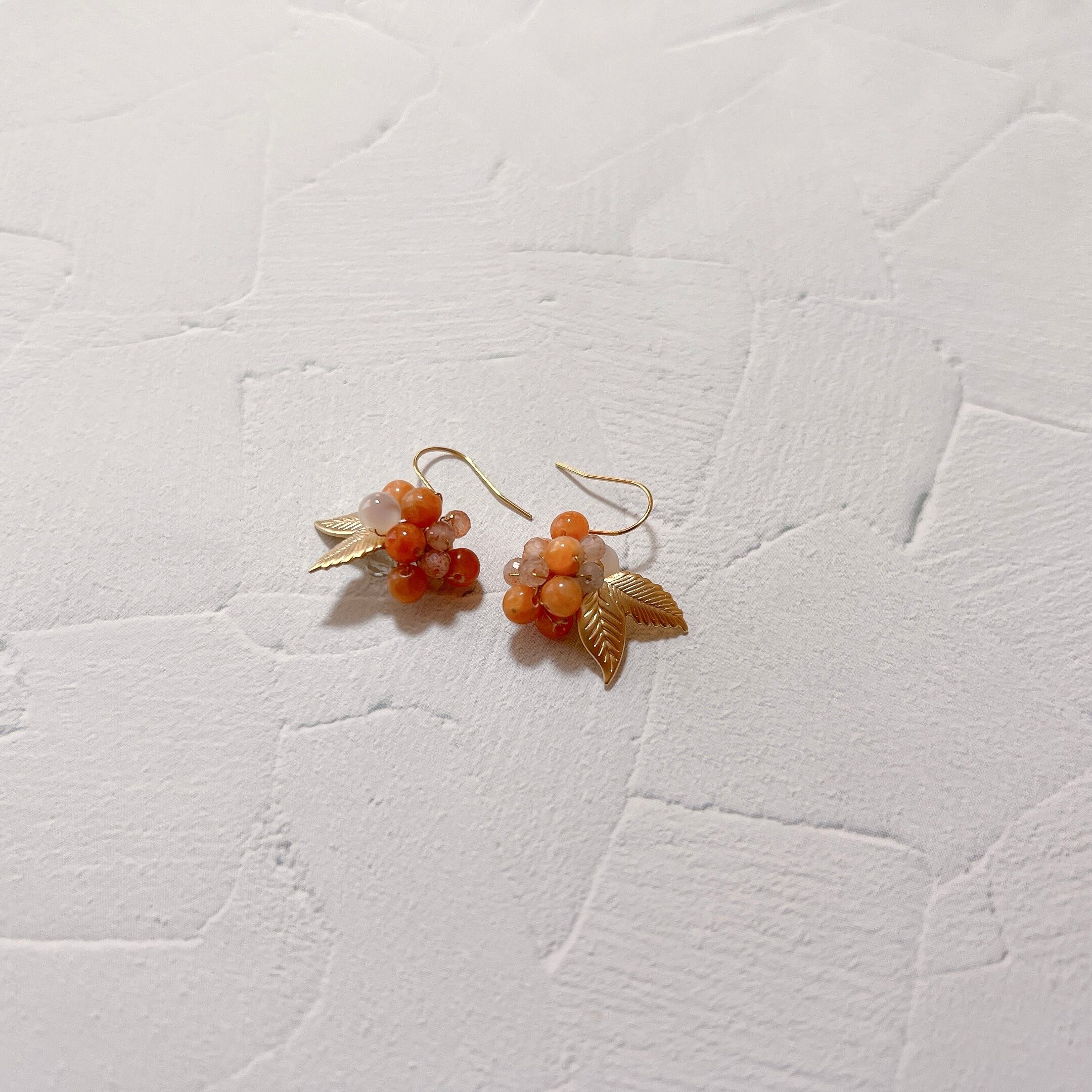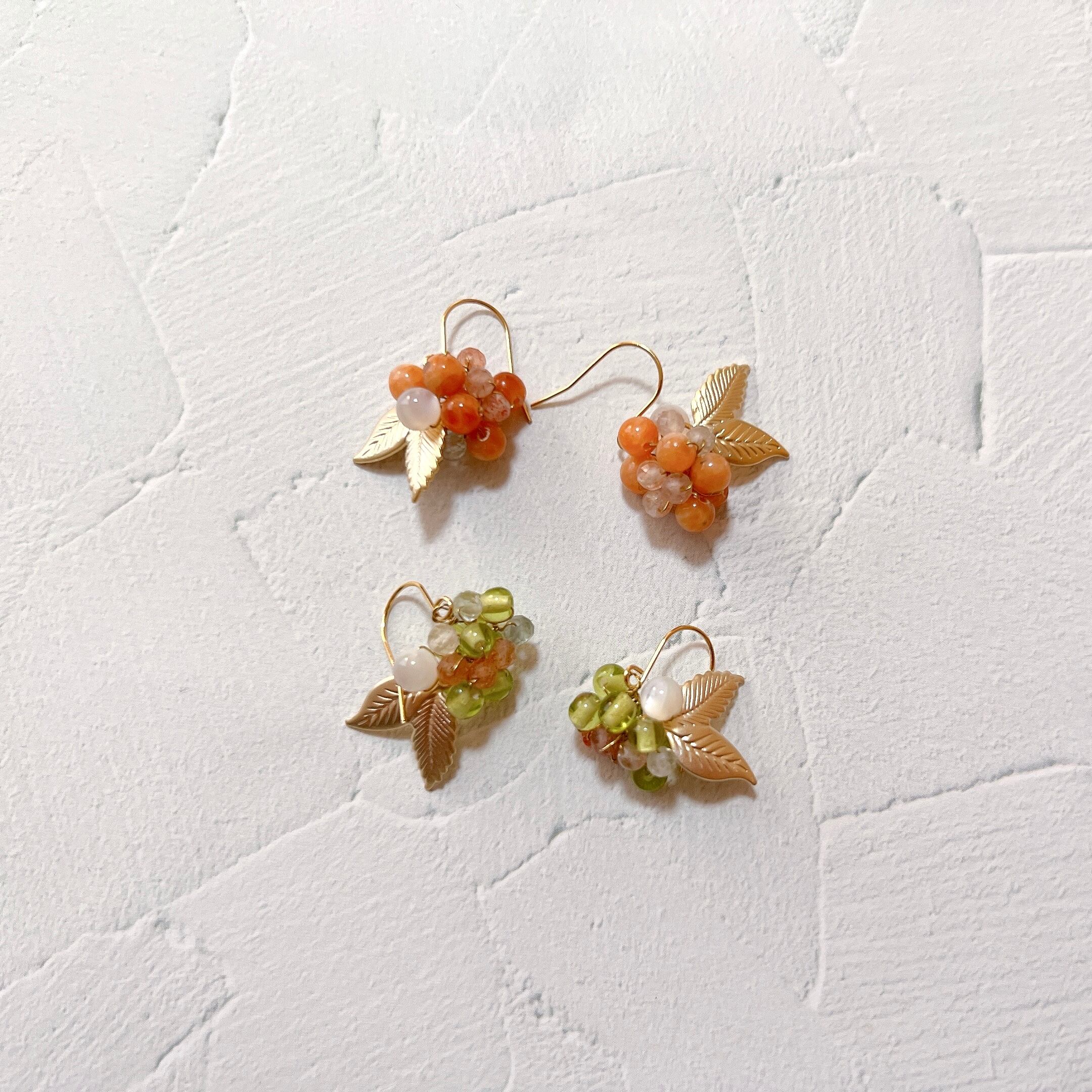オレンジカルサイトのビーズをメインに小さなサンストーンのビーズと1粒だけホワイトシェルのビーズと葉っぱのパーツを使いました。
