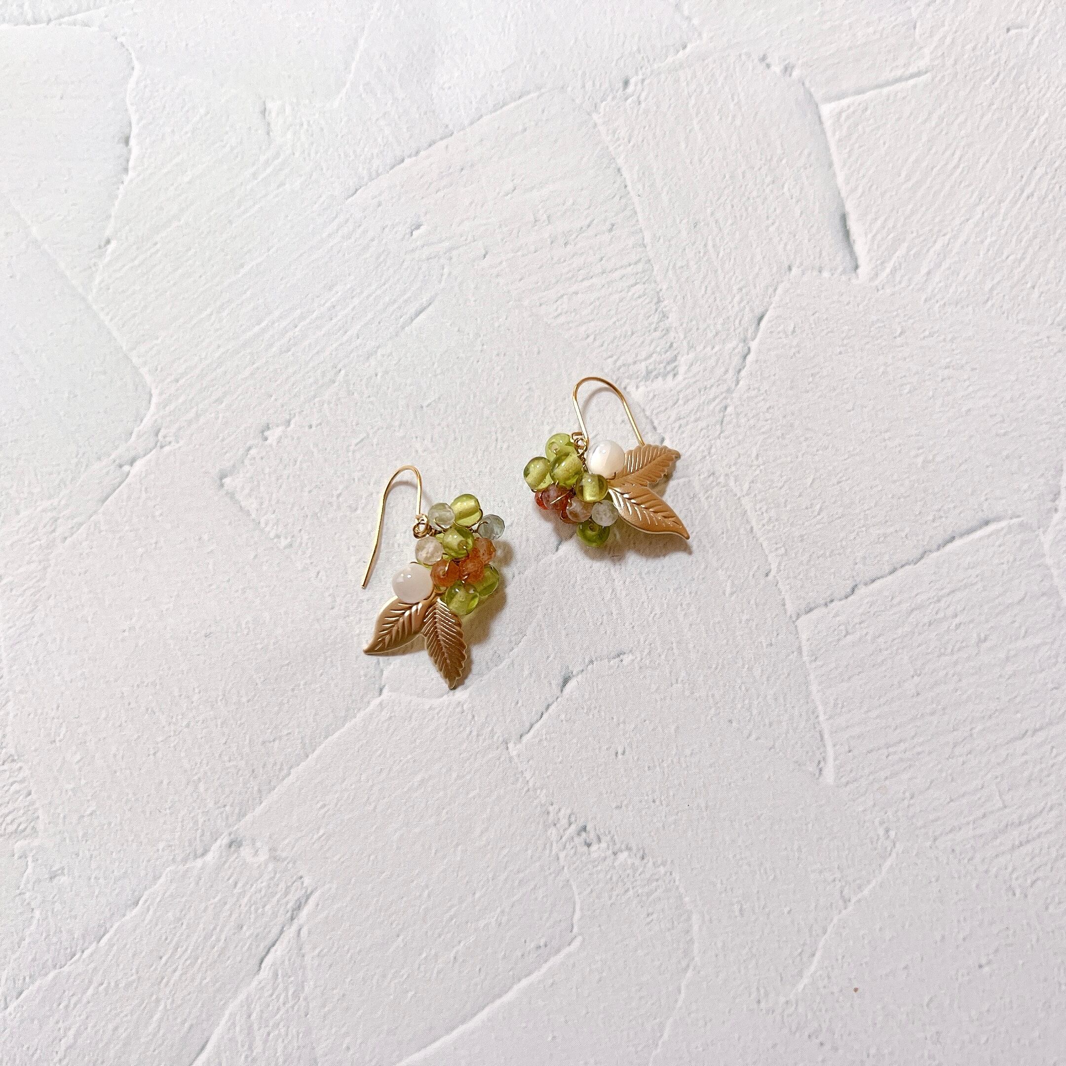 ペリドットのビーズをメインに小さなサンストーンのビーズと1粒だけホワイトシェルのビーズと葉っぱのパーツを使いました。