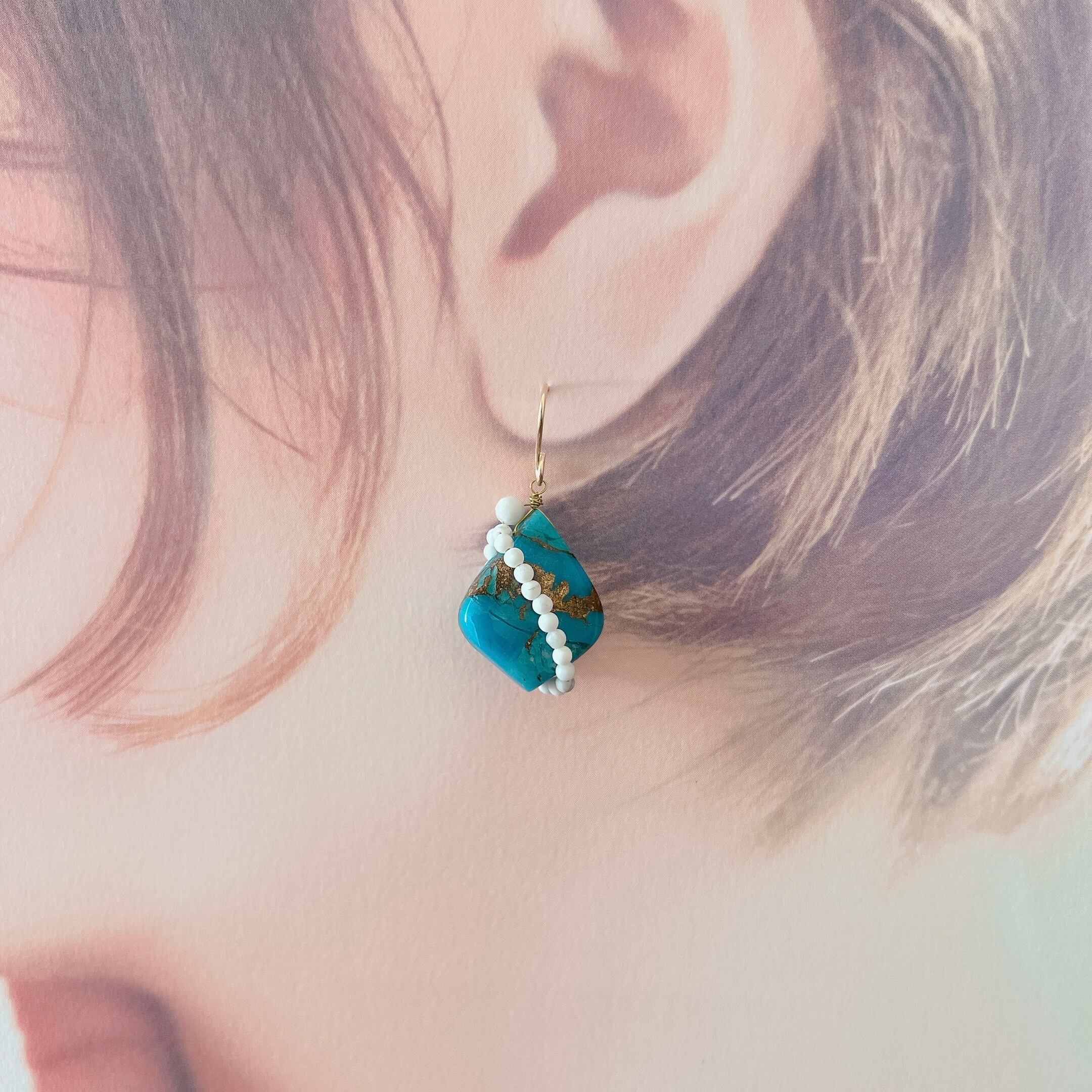 リーフシェイプカットで大きさも2cm弱あるので存在感があります。フロストハウライトとホワイトオニキスのビーズを合わせました。