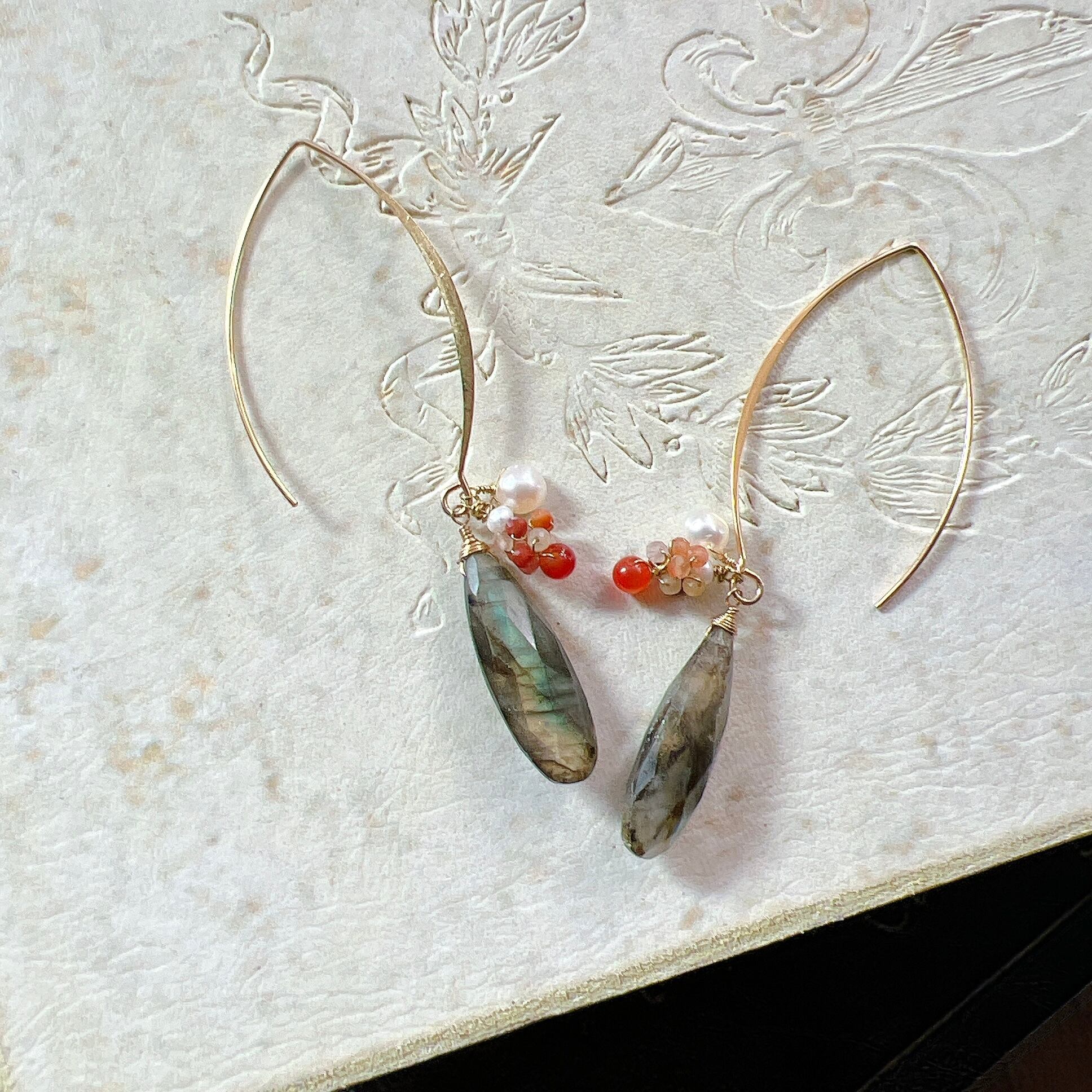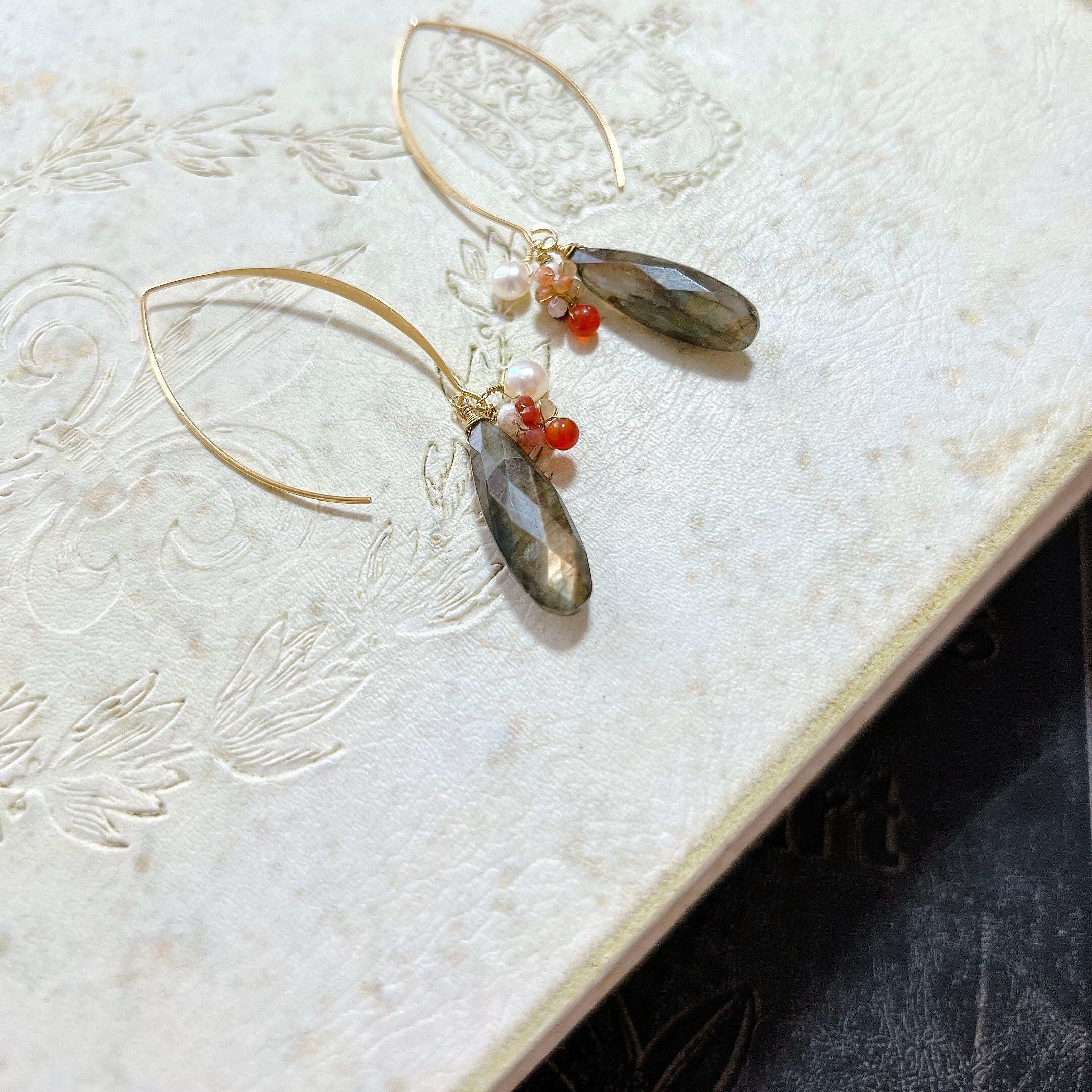 この大きなラブラドライトに、カーネリアン・アンフィボールインクォーツ・淡水パールと、ピアス金具も大きめの金具を合わせました。