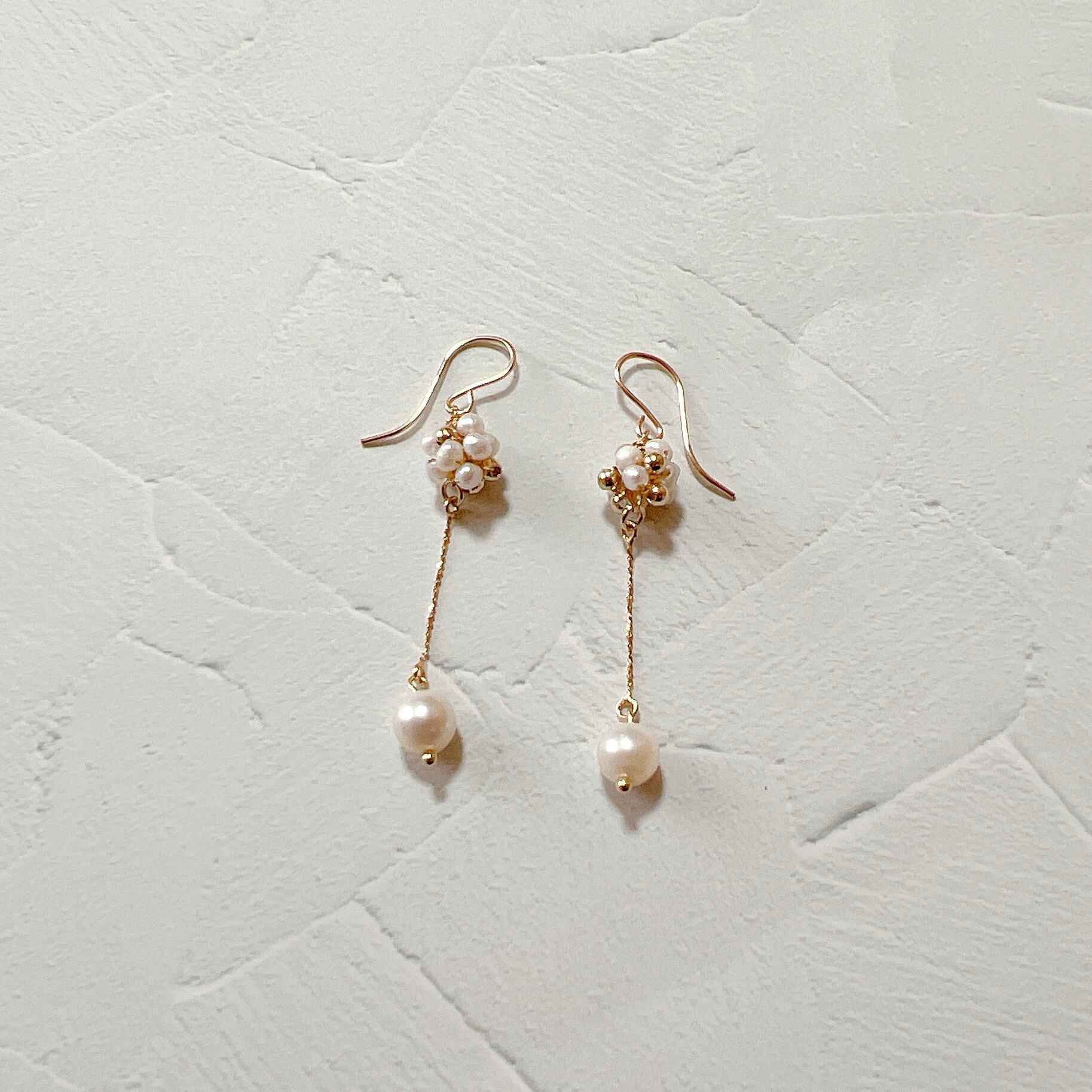 淡水パールとゴールド色の金具を組み合わせて、メインのパールはチェーンでぶら下げてユラユラ動くので可愛いです!