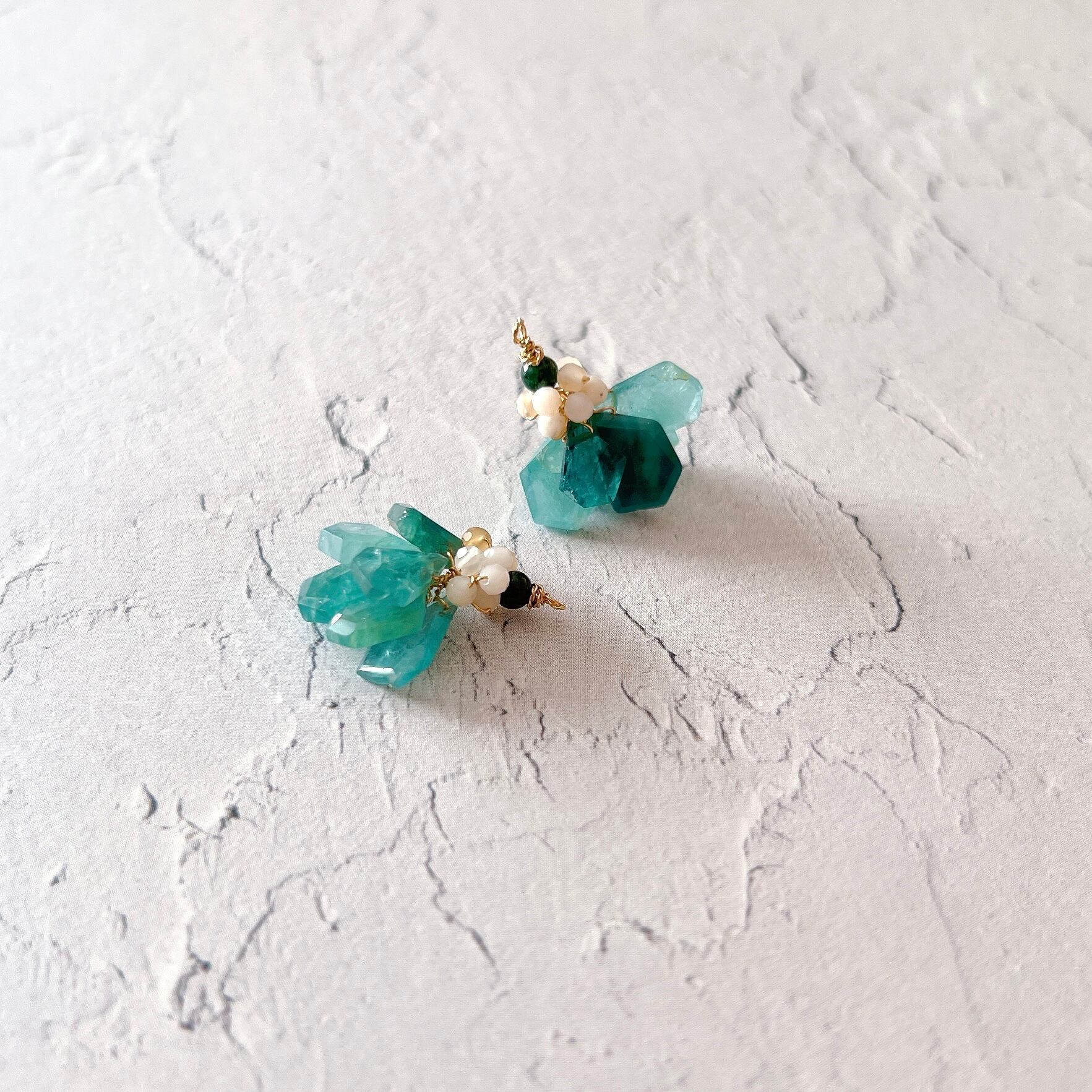 グランディディエライトのスライスカットにホワイトオパールとアイオライトのビーズを合わせました!このなんとも言えないブルーグリーン色が可愛いです。色違いでサンストーンとアンデシンもあります。
